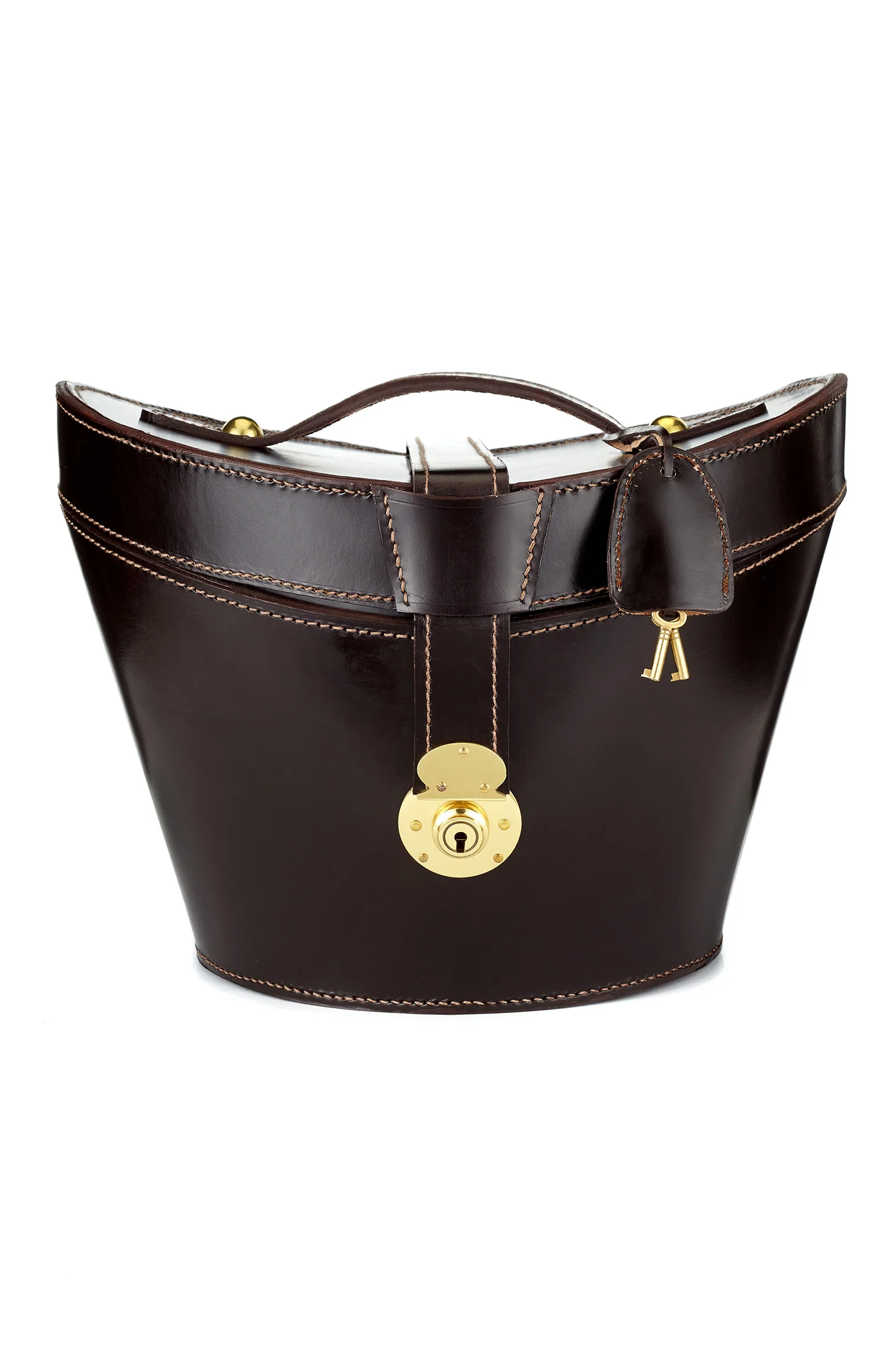 Distinguished by exceptional craftsmanship, the tapered design is handcrafted in England from luxurious bridle leather and features a plush silk velvet lining, carrying handle, and working brass lock.
